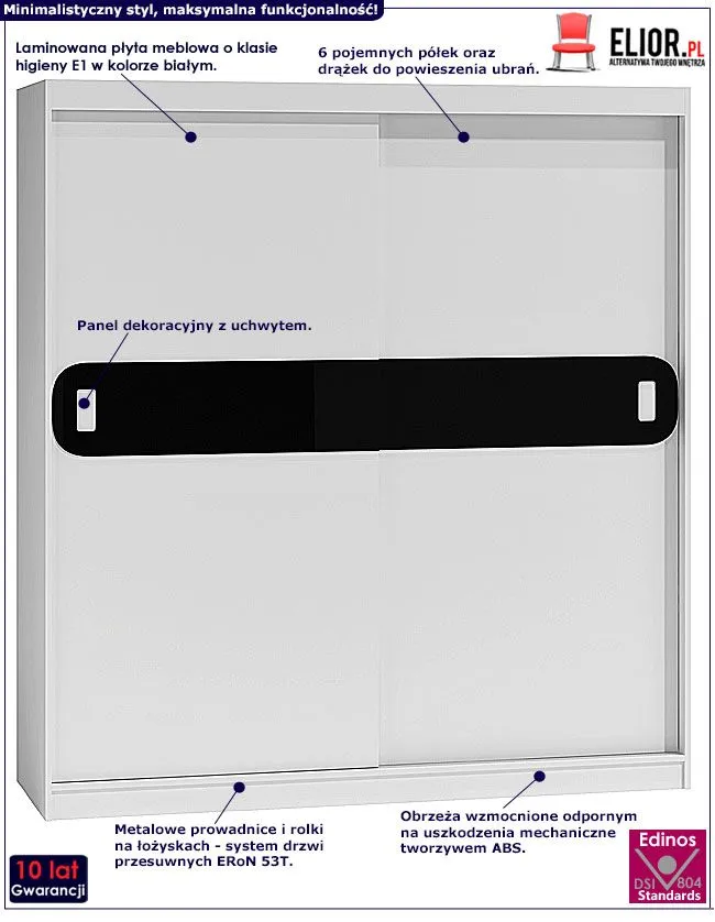 Szafa wykonana została z laminowanej płyty meblowej grubości 16 mm o klasie higieny E1, uszlachetnionej cienkimi filmami melaminowymi. Posiada także specjalne włókna ułożone różnokierunkowo o strukturze sinusoidalnej, co zapewnia nadanie jej cech jakościowych oraz wytrzymałościowych. Dla zwiększenia wytrzymałości i trwałości mebla, obrzeża szafy wykończono odpornym na uszkodzenia mechaniczne tworzywem ABS. 6 pojemnych półek jest wyjątkowo praktycznych i zapewnia komfortowe przechowywanie nie tylko odzieży czy dodatków. Ukryte za drzwiami półki oraz drążek na ubrania wierzchnie umożliwiają Ci funkcjonalne posegregowanie garderoby i jej estetyczny wygląd. Do swojej garderoby z łatwością dostaniesz się dzięki profesjonalnemu systemowi drzwi przesuwnych ERoN 53T - metalowe prowadnice o rolki na łożyskach gwarantują lekkie i płynne otwieranie/zamykanie szafy.