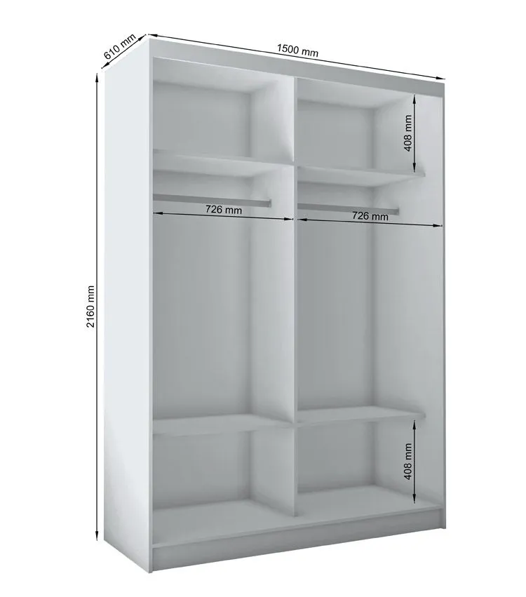 - Wymiary: szerokość: 150 cm, głębokość: 61 cm, wysokość: 216 cm.