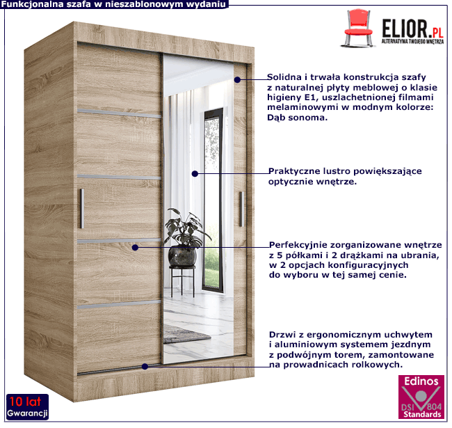 Przesuwna szafa Marmos 3X marki Edinos Premium powstała z najwyższej jakości certyfikowanej, laminowanej płyty meblowej o grubości 16 mm o klasie higieny E1. Płyta posiada specjalistyczne włókna ułożone różnokierunkowo o strukturze sinusoidalnej, co nadaje jej ponadprzeciętnych cech jakościowych oraz wytrzymałościowych. Dla dodatkowego zwiększenia trwałości została uszlachetniona cienkimi filmami melaminowymi. Duże lustro zamontowane na froncie szafy pełni funkcję praktyczną, ale także estetyczną, powiększając wizualnie i rozświetlając pomieszczenie. Dla zwiększenia efektu dekoracyjnego i nadania szafie nowoczesnego charakteru jedną część drzwi przesuwnych zdobią poziome listwy tzw. szprosy wiedeńskie. Szafę Marmos 3X wyposażyliśmy w praktyczne drzwi przesuwne z trwałym systemem jezdnym wykonanym z metalu oraz specjalistycznych tworzyw sztucznych. System jezdny zamontowaliśmy na prowadnicach rolkowych oraz podwójnym torze. Takie rozwiązanie jest sztywniejsze i dzięki temu, dużo trwalsze od tradycyjnych pojedynczych torów. Drzwi przesuwne są funkcjonalnym rozwiązaniem, które doskonale sprawdza się w pomieszczeniach o niewielkim metrażu. Tak zaprojektowana szafa przesuwna Lorenza 2X marki Edinos Premium to nieszablonowy mebel garderobiany, który zauroczy Cię wybitną jakością i sprytnymi rozwiązaniami aranżacyjnymi.