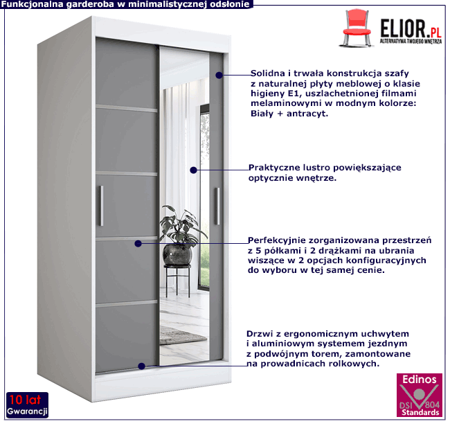 Szafę Marmos 2X zrobiliśmy z najwyższej jakości certyfikowanej, laminowanej płyty meblowej o grubości 16 mm o klasie higieny E1. Dodatkowo uszlachetniliśmy ją cienkimi filmami melaminowymi, by zwiększyć jej trwałość. Płyta posiada specjalistyczne włókna ułożone różnokierunkowo o strukturze sinusoidalnej, co zapewnia nadanie jej cech jakościowych oraz wytrzymałościowych. Duże lustro zamontowane na froncie szafy pełni funkcję praktyczną, ale także estetyczną, powiększając optycznie i rozjaśniając pomieszczenie. Dla zwiększenia efektu dekoracyjnego i nadania szafie nowoczesnego charakteru jedną część drzwi przesuwnych zdobią poziome listwy tzw. szprosy wiedeńskie. Szafę Marmos 2X wyposażyliśmy w praktyczne i wygodne drzwi przesuwne z trwałym systemem jezdnym wykonanym z metalu oraz specjalistycznych tworzyw sztucznych. System jezdny zamontowaliśmy na prowadnicach rolkowych oraz podwójnym torze. Takie rozwiązanie jest sztywniejsze i dzięki temu, dużo trwalsze od tradycyjnych pojedynczych torów. Dodatkowym atutem drzwi przesuwnych jest oszczędność przestrzeni, co jest idealnym rozwiązaniem aranżacyjnym w pomieszczeniach o niewielkim metrażu. Tak zaprojektowana szafa przesuwna Marmos 2X marki Edinos Premium to wyjątkowy mebel, który zachwyci Cię ponadprzeciętną jakością oraz walorami użytkowymi.