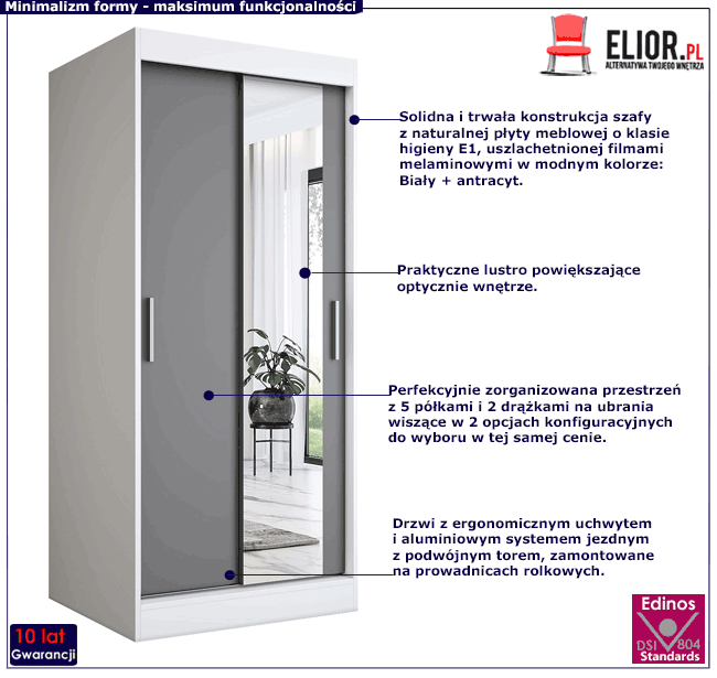 Marka Edinos Premium znana jest z produkcji mebli na najwyższym europejskim poziomie. Nasze produkty powstają wyłącznie z ekologicznych i odnawialnych surowców o ustandaryzowanych parametrach technicznych i użytkowych. Szafa przesuwna Massi 2X to nasz najnowszy model wykonany z naturalnej, laminowanej płyty meblowej o grubości 16 mm, o klasie higieny E1. Płyta została uszlachetniona cienkimi filmami melaminowymi, w celu zwiększenia jej trwałości. Zawartość specjalistycznych włókien o strukturze sinusoidalnej, ułożonych różnokierunkowo, dodatkowo nadaje płycie ponadprzeciętnych cech jakościowych. Praktyczne drzwi przesuwne szafy Massi 2X zostały wyposażone w trwały system jezdny wykonany z metalu oraz specjalistycznych tworzyw sztucznych. System jezdny został zamontowany na prowadnicach rolkowych oraz podwójnym torze. Takie rozwiązanie jest sztywniejsze od tradycyjnych pojedynczych torów, dzięki czemu charakteryzują się ponadprzeciętną trwałością. Drzwi przesuwne nie uderzają o uchwyty podczas przesuwania, a dodatkowym atutem przesuwnej konstrukcji jest oszczędność przestrzeni. Rozwiązanie to idealnie sprawdza się w mieszkaniach o niewielkim metrażu. Lustrzana tafla zamontowana na drzwiach frontowych stanowi nie tylko funkcjonalny dodatek, ale nadaje meblowi elegancji i wizualnej lekkości. Tak zaprojektowana szafa przesuwna Massi 2X marki Edinos Premium zachwyci Cię wybornym stylem i bezkonkurencyjną jakością.