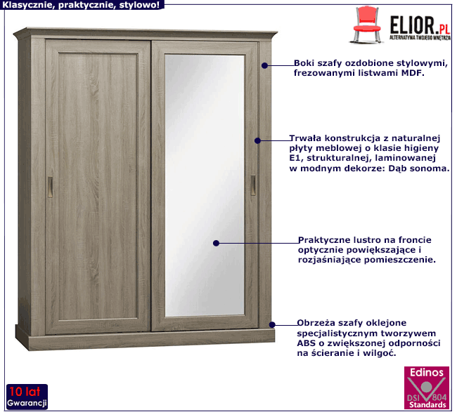 Nie lubisz półśrodków, tymczasowych rozwiązań i tandety? Masz dość przechowywania ubrań w przypadkowych meblach, a tanie szafy ze sklepów meblowych zupełnie nie odpowiadają Twoim oczekiwaniom? Marzysz o wygodnej, trwałej, pięknej szafie z mądrze i praktycznie zaplanowanym wnętrzem? Oto Twoje spełnione marzenie – funkcjonalna szafa przesuwna Metro 3X marki Elior! Ten model przebojem wdarł się na listę naszych bestsellerowych produktów i znika z magazynów w mgnieniu oka. - Nie przegap okazji, zamów przesuwną szafę Metro 3X, a otrzymasz ją w specjalnej atrakcyjnej cenie promocyjnej, tylko 2338 zł już teraz!