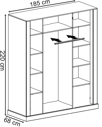 - Wymiary całkowite: wysokość: 220 cm, szerokość: 185 cm, głębokość: 68 cm.