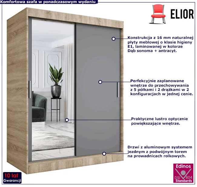 Dotyczy: Szafa przesuwna z lustrem 150 cm antracyt + dąb sonoma - Seko 4X