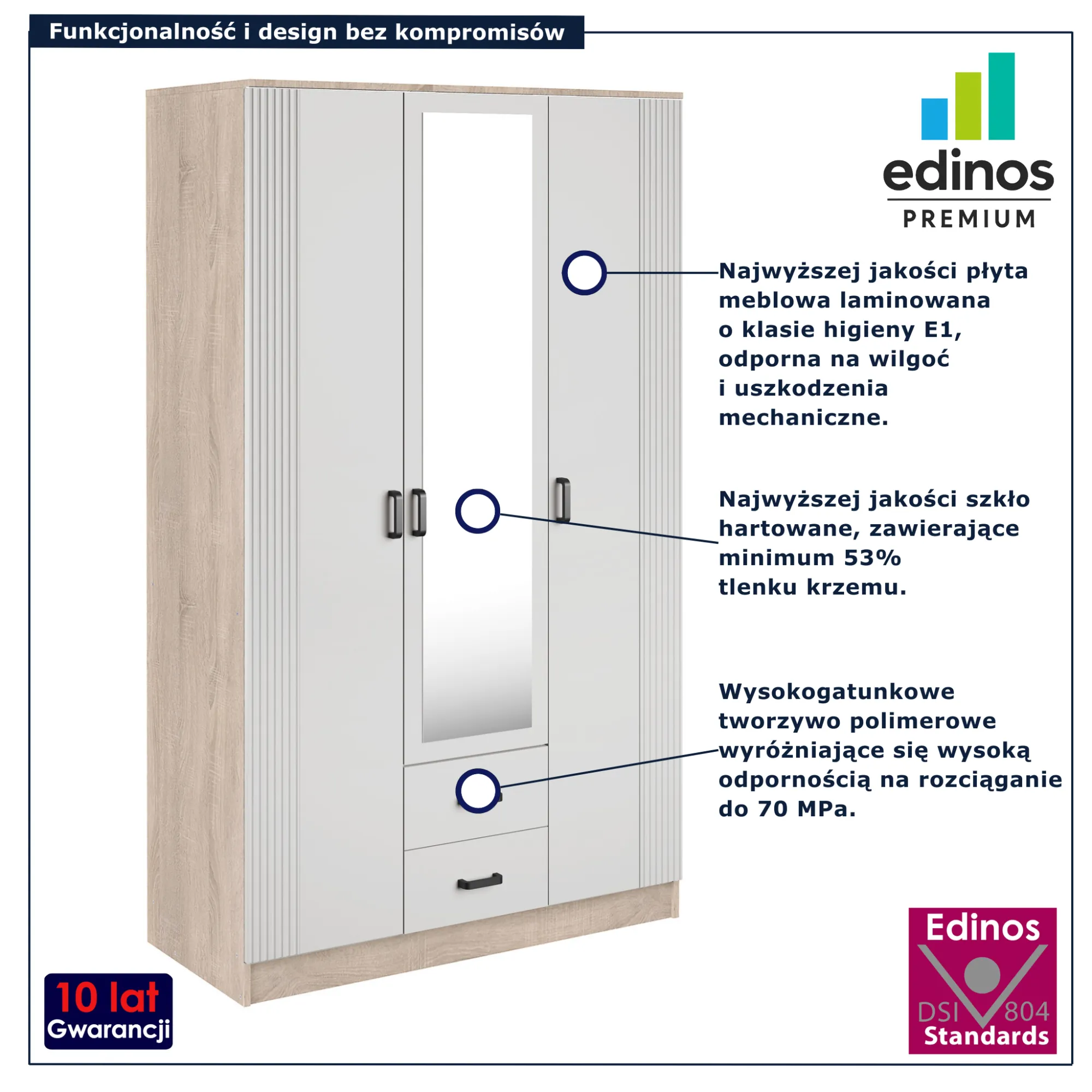 Są meble, które po prostu stoją. I są takie, które realnie zmieniają codzienność. Szafa Elviona marki Edinos Premium zdecydowanie należy do tej drugiej kategorii. To propozycja dla osób, które chcą wreszcie poczuć porządek, przestrzeń i spokój we własnym wnętrzu - bez kompromisów i bez chaosu. Jej szeroka, trzydrzwiowa forma daje dokładnie to, czego zwykle brakuje: miejsce. Na ubrania wiszące, na rzeczy składane, na dodatki, które do tej pory nie miały swojego stałego miejsca. Centralnie umieszczone lustro sprawia, że pomieszczenie od razu zyskuje lekkość i wydaje się większe, a Ty masz wszystko pod ręką, gdy szykujesz się do wyjścia. Wnętrze szafy zostało zaplanowane z myślą o codziennym użytkowaniu. Drążek na ubrania, praktyczne półki i dwie pojemne szuflady pozwalają zachować porządek bez wysiłku. Tu nic nie jest przypadkowe. Każdy element ma swoje zadanie i realnie ułatwia życie. Elviona nie próbuje krzyczeć designem. Zamiast tego oferuje spokojną, dopracowaną formę, która pasuje do różnych wnętrz i pozwala skupić się na tym, co najważniejsze: wygodzie, funkcjonalności i estetyce na lata.
