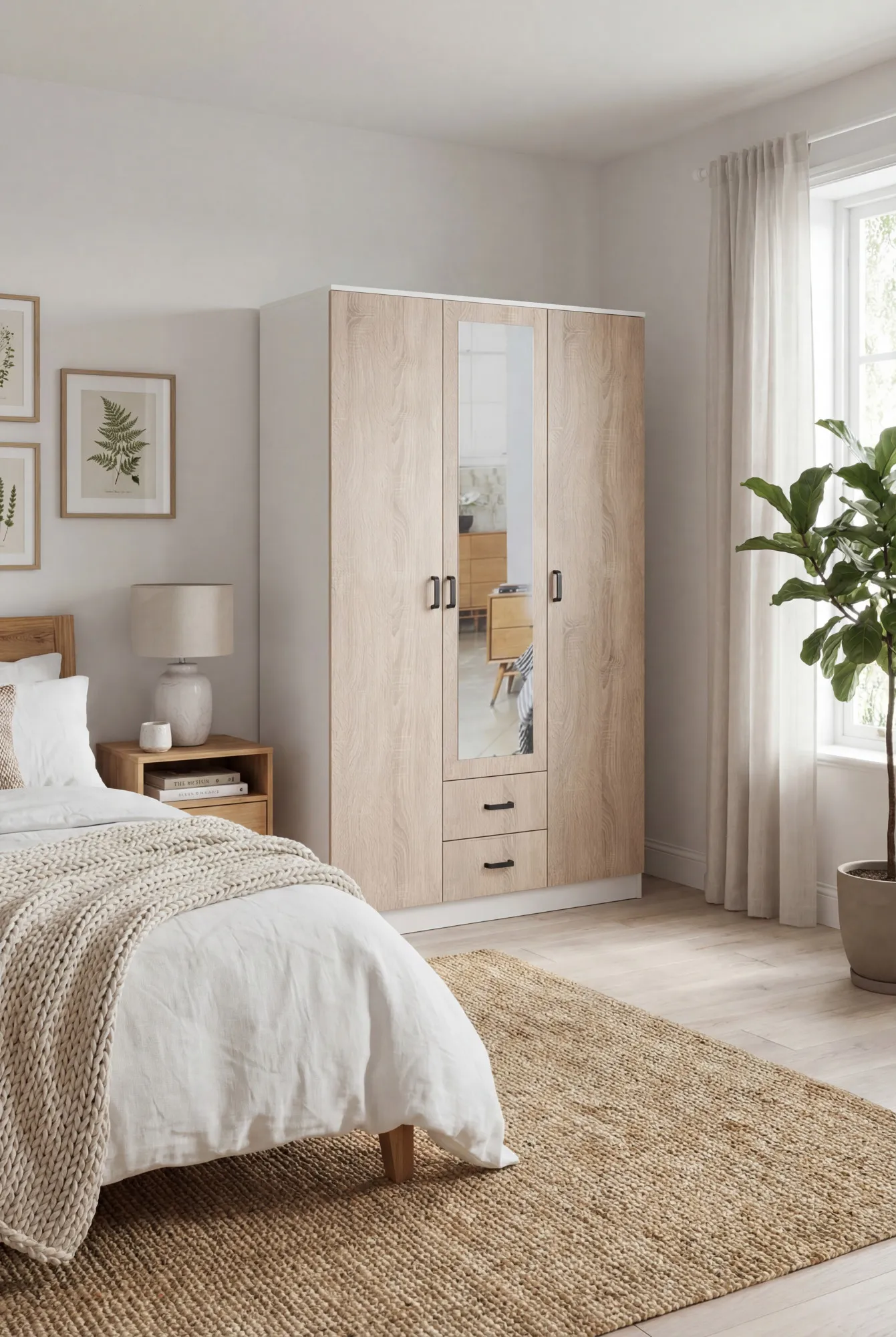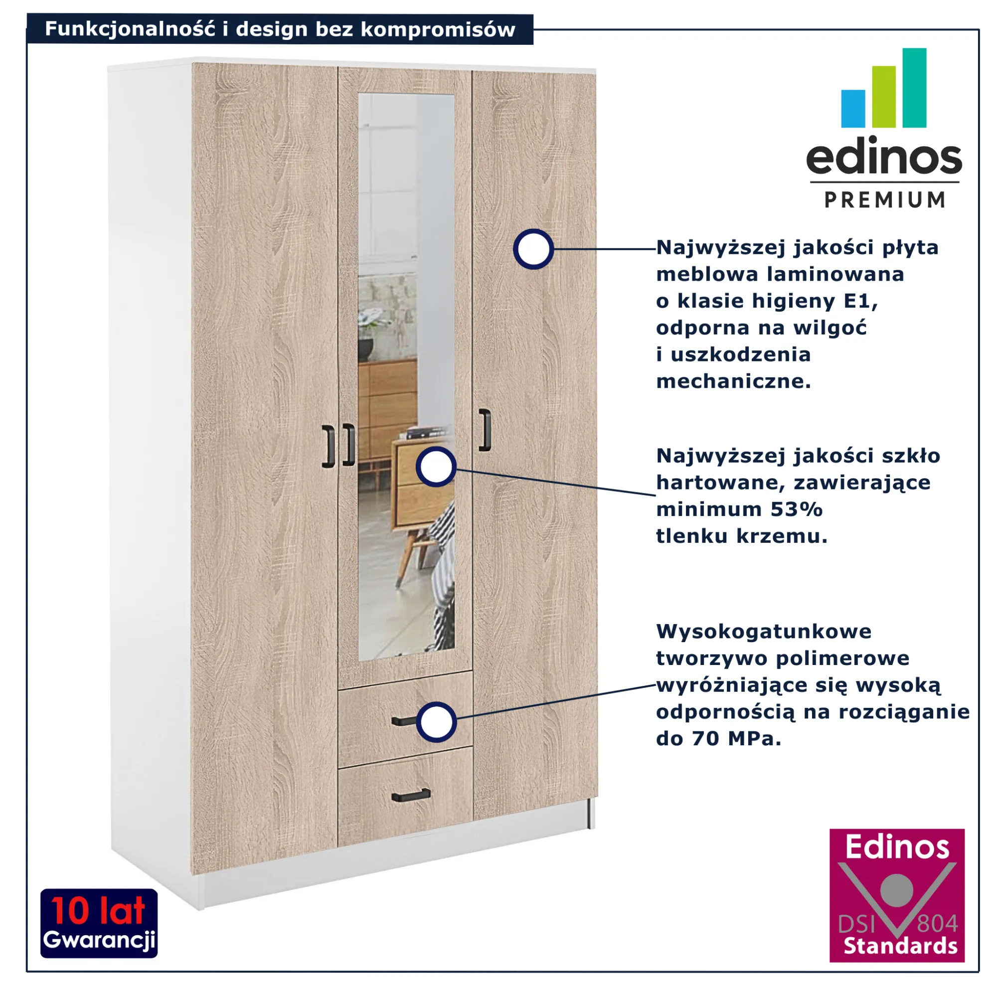 Szafa Montixa marki Edinos Premium to propozycja dla osób, które potrzebują naprawdę dobrze zaplanowanej przestrzeni do przechowywania, bez kompromisów w wyglądzie i wygodzie. Jej szeroka, stabilna bryła sprawia, że idealnie sprawdzi się w sypialni, garderobie lub przestronnym przedpokoju, oferując dużo miejsca na ubrania i dodatki. Centralnie umieszczone lustro wprowadza do wnętrza lekkość, rozjaśnia je i optycznie powiększa, a przy tym staje się praktycznym elementem codziennego użytkowania. Wnętrze szafy zostało zaprojektowane tak, aby maksymalnie ułatwić organizację - drążek na ubrania, pojemne półki oraz dwie dolne szuflady pozwalają utrzymać porządek i szybko odnaleźć wszystko, czego potrzebujesz. Montixa to szafa, która porządkuje przestrzeń i daje poczucie kontroli nad codziennym chaosem.