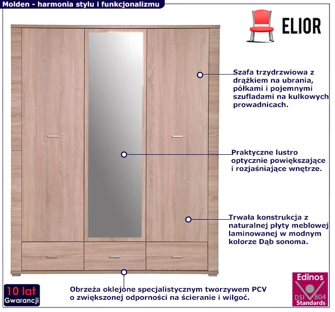 • Funkcjonalizm: Przestronne wnętrze z półkami i drążkiem oraz 3 praktyczne szuflady gwarantują sporo miejsca do przechowywania i porządek w pomieszczeniu.