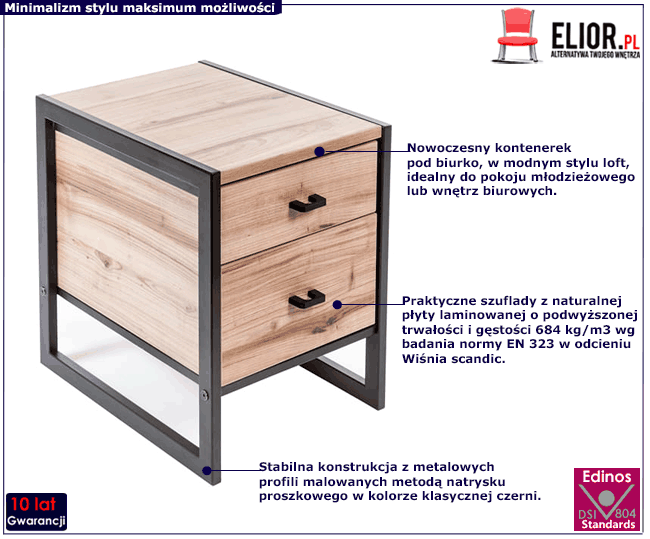 Industrialny kontenerek Maso 12X marki Elior wyróżnia się nie tylko zastosowaniem nowoczesnych, doskonałej jakości materiałów, ale także fenomenalnym designem. Prosta forma, oszczędność w detalach oraz kompaktowe rozmiary tworzą wyjątkowy mebel o uniwersalnym przeznaczeniu i wyjątkowym stylu. Maso 12X doskonale sprawdzi się jako kontenerek pod biurko w gabinecie lub biurze. Świetnie zaaranżuje sypialnię, gdzie zagra rolę wygodnego stolika nocnego. Maso 12X w komplecie z pozostałymi meblami z serii Verdon fenomenalnie urządzi pokój dziecięcy i młodzieżowy, stanowiąc komfortowy stolik nocny lub szafkę na przybory do pisania. Minimalistyczny design zestawiony z naturalną kolorystyką frontów w odcieniu wisnia scandic i klasyczną czernią metalowych profili nie przytłoczy wnętrza, ale nada mu nowoczesnego charakteru z nutką modernistycznej gracji. Kontenerek Maso 12X jest wprost stworzony do wnętrz w stylu loft i industrial. Doskonale odnajdzie się w przestrzeniach urządzonych w klimatach skandynawskich, klasycznych oraz steampunk. Najlepsze są proste rozwiązania! Wybierz szafkę Maso 12X i sprawdź jak fenomenalnie uzupełni wystrój Twojego wnętrza.