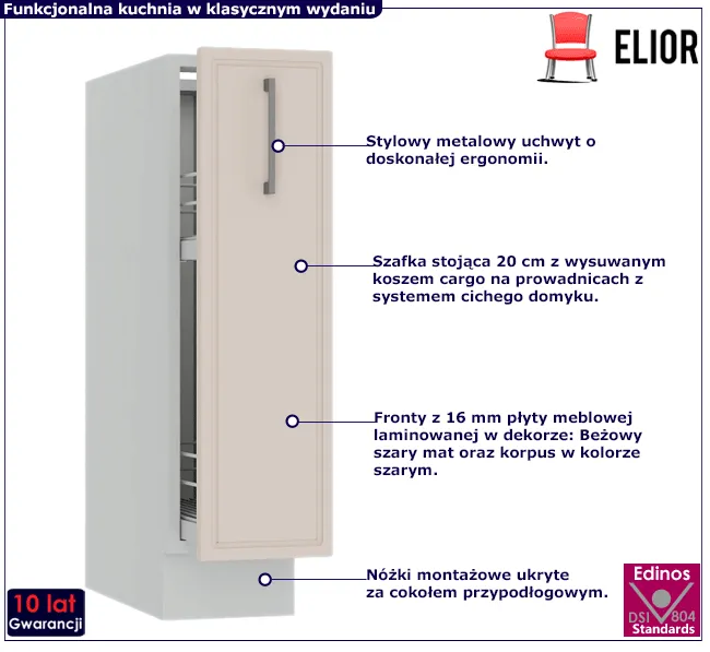 Kolekcja mebli kuchennych Staford marki Edinos Premium to wyjątkowy mariaż rzemieślniczego kunsztu z nowoczesnym wzornictwem. Kolekcja wyróżnia się klasyczną formą, idealną ergonomią oraz unikalną kolorystyką frontów w dekorze Beżowy szary mat. Seria Staford składa z się z 34 elementów, przeznaczonych do kompleksowej aranżacji kuchni i aneksów kuchennych. Kompaktowe wymiary, prosty montaż, łatwość obsługi oraz funkcjonalizm użytkowy to najważniejsze atuty z długiej listy zalet serii Staford. A możliwość skomponowania własnego zestawu oraz atrakcyjna cena sprawia, że Staford jest jedną z najpopularniejszych kolekcji kuchennych w naszej ofercie. Poznaj kolejną propozycję z serii Staford marki Edinos Premium – dolną szafkę kuchenną cargo 20 cm Caroni 4X.