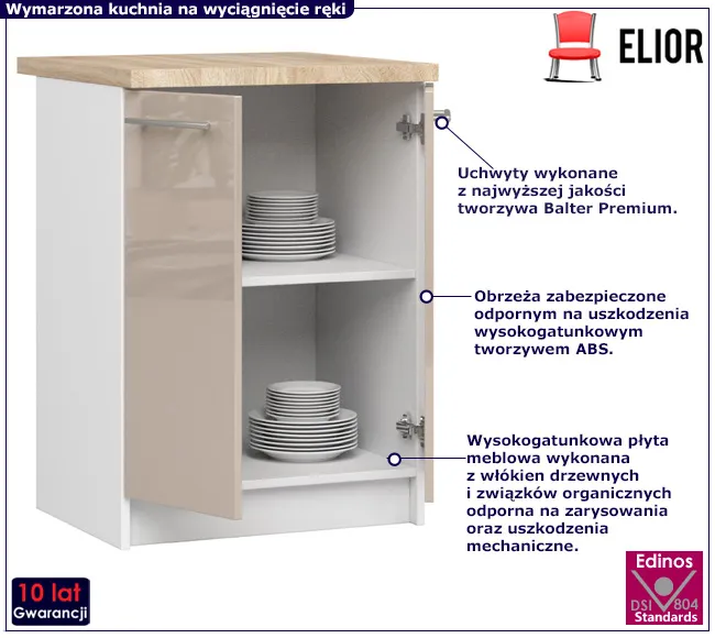 Dolna szafka kuchenna Poli 5X marki Edinos Premium to propozycja, która pozwoli Ci skomponowac perfekcyjną kuchnię. Doskonale wpisuje się w różnorodne aranżacje, oferując zarówno estetykę, jak i funkcjonalność, które są niezbędne w każdej kuchni. W swoim wnętrzu ukrywa pojemne półki w których bez problemu umieścisz zastawę, garnki, miski lub wiele inncyh przedmiotów kuchennych.