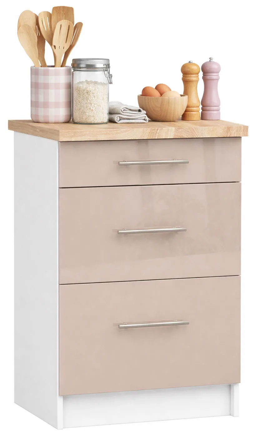 • Optymalna przestrzeń do przechowywania: trzy pojemne szuflady zapewniają miejsce na wszelkie kuchenne akcesoria, od sztućców po naczynia, utrzymując Twoją kuchnię w idealnym porządku.
