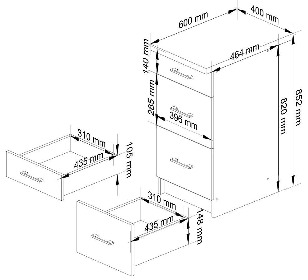 • Optymalna przestrzeń do przechowywania: trzy pojemne szuflady zapewniają miejsce na wszelkie kuchenne akcesoria, od sztućców po naczynia, utrzymując Twoją kuchnię w idealnym porządku.