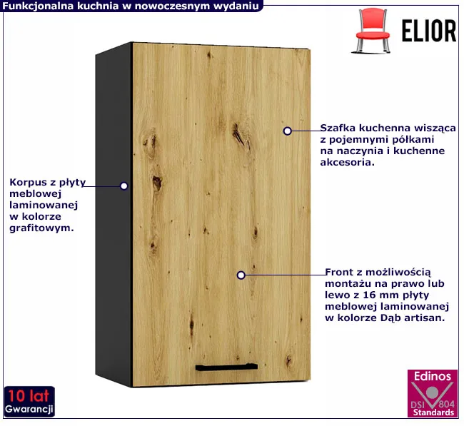 Kolekcja mebli kuchennych Beril marki Elior to zaproszenie do świata gdzie prostota i funkcjonalność tworzą przestrzeń do kreatywnej przygody w świecie smaków i aromatów. Zjawiskowy design frontów w 2 wydaniach: ciepłej barwie dębu artisan lub eleganckim graficie nadaje wnętrzu ponadczasowej elegancji. Atutem kolekcji jest wysoka jakość w atrakcyjnej cenie, profesjonalne wykonanie oraz możliwość stworzenia własnego zestawu kuchennego dostosowanego do potrzebBogaty wybór modeli to doskonały przepis na aranżację każdej kuchni, od tych przestronnych, przez niewielkie, aż po mini aneksy kuchenne. Kolekcja Beril składa się z praktycznych szafek dolnych i górnych, mebli do zabudowy sprzętu AGD, szafek na zlew oraz szafek z koszami cargo.  Oto kolejna propozycja z kolekcji Beril – szafka górna Coleo 19X!