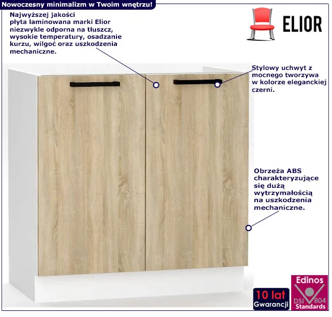 • Materiał: najwyższej jakości płyta laminowana marki Elior niezwykle odporna na warunki panujące w kuchni, wysokogatunkowe tworzywo, mocne najwyższej jakości metalowe zawiasy.