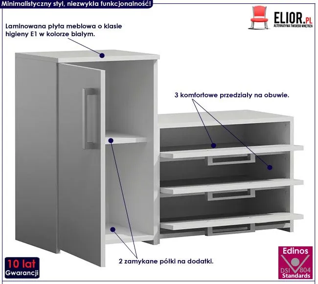 - Kolor: Biały. Kliknij w link i sprawdź także inne białe szafki na buty w sklepie Edinos.pl. Stwórz swój praktyczny zestaw mebli.