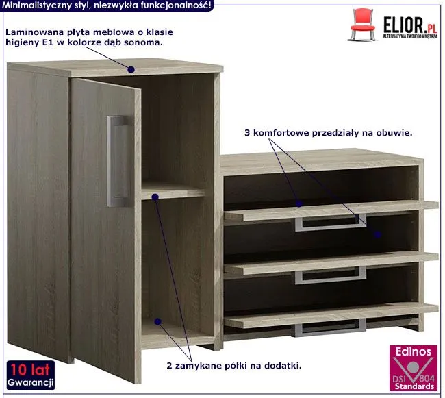 - Kolor: Dąb Sonoma. Kliknij w link i sprawdź także inne szafki na buty dąb sonoma w sklepie Edinos.pl. Stwórz swój praktyczny zestaw mebli.