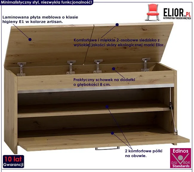 - Kolor: Dąb Artisan. Kliknij w link i sprawdź także inne szafki na buty z siedziskiem w sklepie Edinos.pl. Stwórz swój praktyczny zestaw mebli.