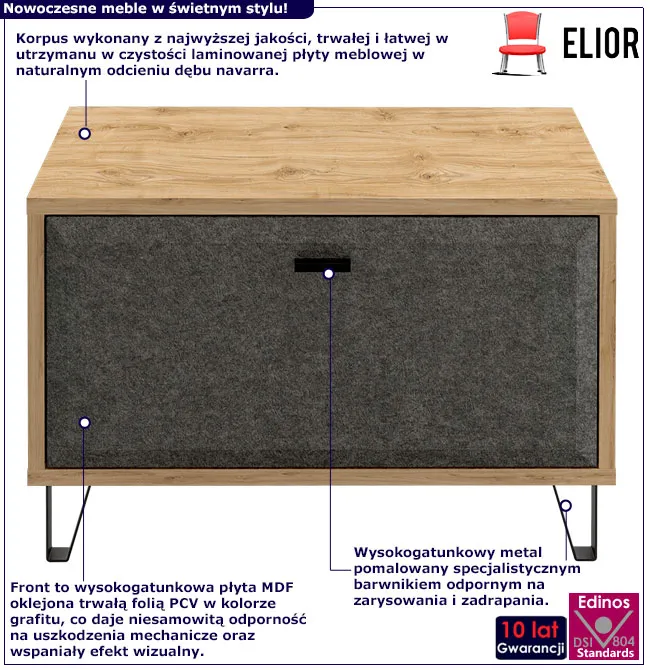 • Wysokiej jakości materiały: korpus wykonany z laminowanej płyty meblowej w naturalnym odcieniu dębu navarra oraz front z płyty MDF oklejonej trwałą folią PCV w kolorze grafitu.