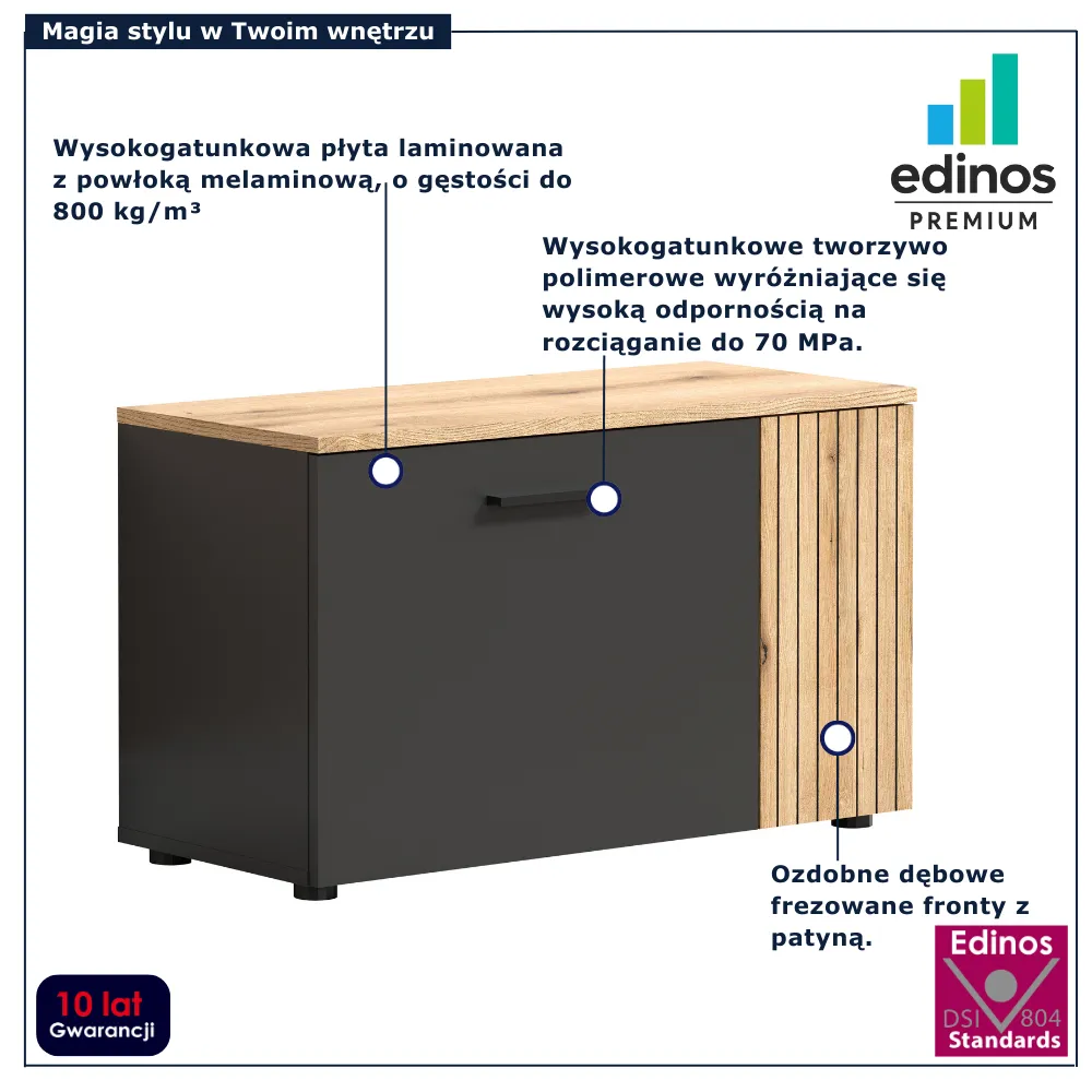 • Produkt posiada certyfikat jakości "Edinos Standards DSI 804", który potwierdza najwyższą jakość wykonania mebla oraz pełny stopień zgodności poszczególnych jednostek wytworzonego wyrobu z przyjętym wzorcem.