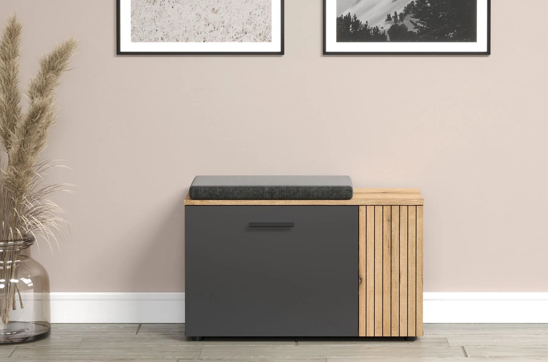 Przedpokój z wykorzystaniem szafki na buty Assoni 10X grafit + dąb evok