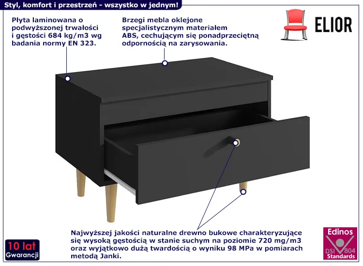 • Produkt posiada certyfikat jakości "Edinos Standards DSI 804", który potwierdza najwyższą jakość wykonania mebla oraz pełny stopień zgodności poszczególnych jednostek wytworzonego wyrobu z przyjętym wzorcem.