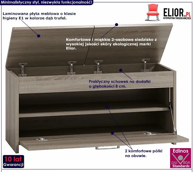 Praktyczna w użytkowaniu szafka na buty Cella 3X wyróżnia się nie tylko swoją unikalną formą, ale także zastosowaniem materiałów najlepszej jakości. Konstrukcja mebla wykonana została z laminowanej płyty meblowej o klasie higieny E1, uszlachetnionej cienkimi filmami melaminowymi. Posiada także specjalne włókna ułożone różnokierunkowo o strukturze sinusoidalnej, co zapewnia nadanie jej cech jakościowych oraz wytrzymałościowych. Dla zwiększenia trwałości mebla, obrzeża szafki wykończono odpornym na uszkodzenia mechaniczne oraz chemiczne tworzywem ABS. Designerskie siedzisko mebla w kolorze białym pokryte zostało najwyższej jakości ekoskórą (skórą ekologiczną), łatwą do utrzymania w czystości. Ekoskóra używana przy produkcji mebli marki Elior jest o wiele bardziej odporna na słońce oraz substancje płynne , co pozwala Ci na długie i bezpieczne użytkowanie. Już nie musisz się martwić, że rozlany napój spowoduje konieczność wymiany mebla. Skóra ekologiczna została pokryta warstwą polichlorku winylu. Dekoracyjna listwa aluminiowa nadaje szafce modnego, niebanalnego designu. Uchylne drzwiczki z dwoma półkami na obuwie są wyjątkowo praktyczne i zapewniają komfortowe przechowywanie wszystkich Twoich ulubionych par. W schowku o głębokości 8 cm przechowasz również czapki, szale czy inne niezbędne dodatki. Praktyczne, dwuosobowe siedzisko ułatwia założenie obuwia nie tylko dzieciom i osobom starszym. Stonowana kolorystyka i prosta forma sprawiają, że szafka Leni doskonale sprawdza się we wnętrzach urządzonych w stylu skandynawskim, jak też minimalistycznym czy nowoczesnym. Stwórz w swoim domu niepowtarzalny klimat z meblem marki Elior!
