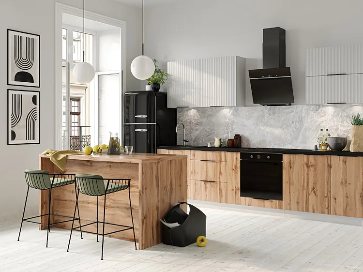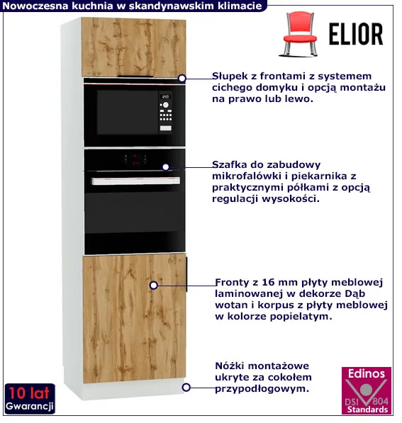 Kolekcja mebli kuchennych Madlen marki Elior to więcej niż meble – to zaproszenie do świata gdzie prostota i funkcjonalność tworzą przestrzeń do kreatywnej przygody w świecie smaków i aromatów. Zjawiskowy design frontów w 2 unikalnych wydaniach: ciepłej barwie dębu wotan lub skandynwskiej szarości nadaje wnętrzu ponadczasowej elegancji. Atutem kolekcji jest wysoka jakość w atrakcyjnej cenie, profesjonalne wykonanie oraz możliwość stworzenia własnego zestawu kuchennego dostosowanego do potrzeb. Kolekcja Madlen składa się z 32 elementów: szafek dolnych i górnych, słupków, mebli do zabudowy sprzętu AGD: piekarnika, mikrofalówki, płyt grzewczych, okapów, zmywarek, szafek na zlew oraz szafek z suszarką na naczynia i koszami cargo. Bogaty wybór modeli to doskonały przepis na aranżację każdej kuchni, od tych przestronnych, przez niewielkie, aż po mini aneksy kuchenne. Oto kolejna propozycja z kolekcji Madlen – słupek na mikrofalę i piekarnik Livin 12X!