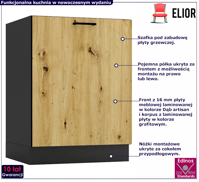 Kolekcja mebli kuchennych Beril marki Edinos Premium to zaproszenie do świata gdzie prostota i funkcjonalność tworzą przestrzeń do kreatywnej przygody w świecie smaków i aromatów. Zjawiskowy design frontów w 2 wydaniach: ciepłej barwie dębu artisan lub eleganckim graficie nadaje wnętrzu ponadczasowej elegancji. Atutem kolekcji jest wysoka jakość w atrakcyjnej cenie, profesjonalne wykonanie oraz możliwość stworzenia własnego zestawu kuchennego dostosowanego do potrzebBogaty wybór modeli to doskonały przepis na aranżację każdej kuchni, od tych przestronnych, przez niewielkie, aż po mini aneksy kuchenne. Kolekcja Beril składa się z praktycznych szafek dolnych i górnych, mebli do zabudowy sprzętu AGD, szafek na zlew oraz szafek z koszami cargo.  Oto kolejna propozycja z kolekcji Beril –  szafka pod płytę grzewczą Coleo 6X!