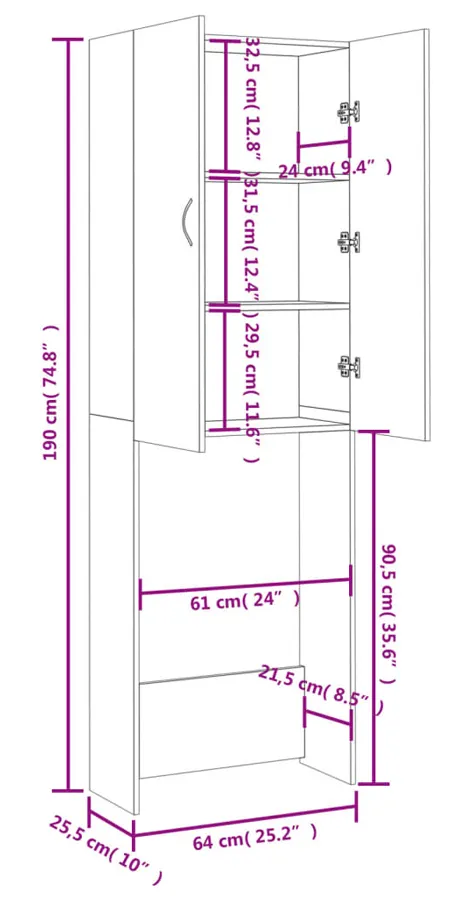 • szerokość: 64 cm, głębokość: 25,5 cm, wysokość: 190 cm.