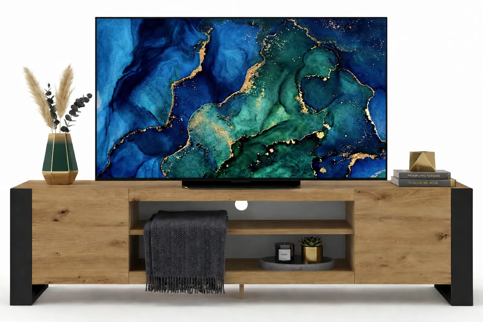 Szafkę rtv Lyra 4X zrobiliśmy z najwyższej jakości 16 mm laminowanej płyty meblowej o klasie higieny E1. Płyta meblowa została zbudowana z włókien drzewnych i związków organicznych w warunkach wysokiego ciśnienia i temperatury. Włókna ułożone są różnokierunkowo, co podnosi parametry wytrzymałościowe i jakościowe surowca. Dodatkowo, w celu zwiększenia trwałości, płytę uszlachetniliśmy cienkimi filmami melaminowymi. Obrzeża szafki zostały precyzyjnie oklejone specjalistycznym tworzywem ABS o zwiększonej odporności na ścieranie i wilgoć. Charakterystyczne nogi z laminowanej płyty dzięki dodatkowej podpórce na środku gwarantują stabilność. A dzięki unikalnej formie szerokiej ramy w kolorze matowej czerni nadają meblowi wyjątkowego uroku. Wnętrze szafki zostało zorganizowane zgodnie z filozofią slow life – funkcjonalnie, praktycznie i bez zbędnych elementów. Dwie boczne szafki uporządkują domową filmotekę, dokumenty lub akcesoria. Frontowe drzwi dzięki systemowi Push to open otwierają się bezproblemowo po lekkim naciśnięciu. Otwarte półki z otworem na kable zmieszczą dekodery lub konsole. Szeroki blat posłuży jako podstawa na telewizor, sprzęt audio lub przestrzeń do eksponowania dekoracji. Tak zaprojektowana szafka rtv Lyra 4X marki Edinos Premium zachwyci Cię jakością i funkcjonalizmem.
