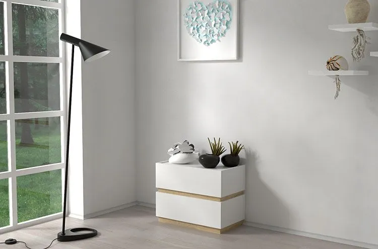 Komoda wykonana została z laminowanej płyty meblowej uszlachetnionej cienkimi filmami melaminowymi. Posiada także specjalne włókna ułożone różnokierunkowo o strukturze sinusoidalnej, co zapewnia nadanie jej cech jakościowych oraz wytrzymałościowych. Dla zwiększenia wytrzymałości i trwałości mebla, obrzeża komody wykończono odpornym na uszkodzenia mechaniczne tworzywem PCV. Szuflady na prowadnicach rolkowych są gwarancją wygodnego i przede wszystkim bezpiecznego użytkowania. Bezuchwytowe fronty podkreślają nowoczesny i modernistyczny styl mebla. Dwie pojemne szuflady są wyjątkowo praktyczne i zapewniają komfortowe przechowywanie nie tylko książek czy kosmetyków. Stonowana kolorystyka i prosta, współczesna forma sprawiają, że stolik nocny Tibia doskonale sprawdza się we wnętrzach urządzonych zarówno w stylu skandynawskim, jak też minimalistycznym czy nowoczesnym. Świetnie nadaje się także do wnętrz dziecięcych czy młodzieżowych. Stwórz w swoim domu niepowtarzalny i ciepły klimat z szafką marki Elior!