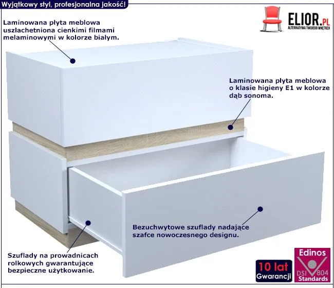 - Kolor: Fronty mebla w kolorze białym, listy środkowe - dąb sonoma. Kliknij w link i sprawdź także inne białe szafki nocne w sklepie Edinos.pl. Stwórz swój praktyczny zestaw mebli.