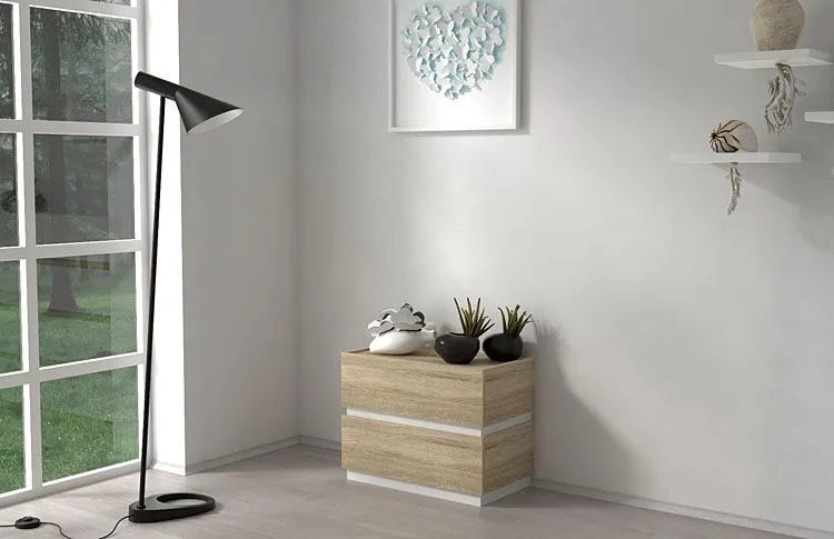 Komoda wykonana została z laminowanej płyty meblowej uszlachetnionej cienkimi filmami melaminowymi. Posiada także specjalne włókna ułożone różnokierunkowo o strukturze sinusoidalnej, co zapewnia nadanie jej cech jakościowych oraz wytrzymałościowych. Dla zwiększenia wytrzymałości i trwałości mebla, obrzeża komody wykończono odpornym na uszkodzenia mechaniczne tworzywem PCV. Szuflady na prowadnicach rolkowych są gwarancją wygodnego i przede wszystkim bezpiecznego użytkowania. Bezuchwytowe fronty podkreślają nowoczesny i modernistyczny styl mebla. Dwie pojemne szuflady są wyjątkowo praktyczne i zapewniają komfortowe przechowywanie nie tylko książek czy kosmetyków. Stonowana kolorystyka i prosta, współczesna forma sprawiają, że stolik nocny Tibia doskonale sprawdza się we wnętrzach urządzonych zarówno w stylu skandynawskim, jak też minimalistycznym czy nowoczesnym. Świetnie nadaje się także do wnętrz dziecięcych czy młodzieżowych. Stwórz w swoim domu niepowtarzalny i ciepły klimat z szafką marki Elior!