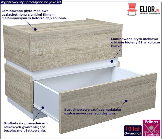 - Kolor: Fronty mebla w kolorze dąb sonoma, listy środkowe - białe. Kliknij w link i sprawdź także inne szafki nocne dąb sonoma w sklepie Edinos.pl. Stwórz swój praktyczny zestaw mebli.