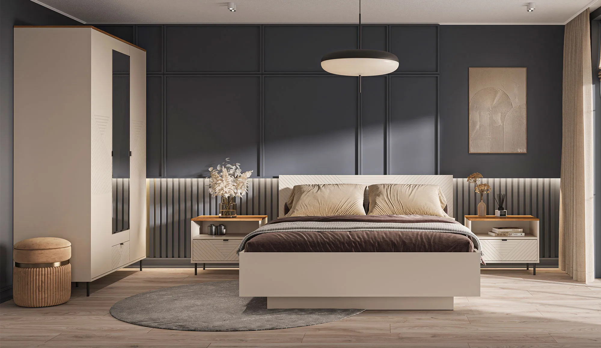 Sypialnia z wykorzystaniem mebli z kolekcji Fiassi kaszmir + dąb castello