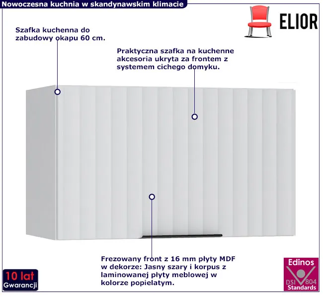 Kolekcja mebli kuchennych Madlen marki Elior to więcej niż meble – to zaproszenie do świata gdzie prostota i funkcjonalność tworzą przestrzeń do kreatywnej przygody w świecie smaków i aromatów. Zjawiskowy design frontów w 2 unikalnych wydaniach: ciepłej barwie dębu wotan lub skandynwskiej szarości nadaje wnętrzu ponadczasowej elegancji. Atutem kolekcji jest wysoka jakość w atrakcyjnej cenie, profesjonalne wykonanie oraz możliwość stworzenia własnego zestawu kuchennego dostosowanego do potrzeb. Kolekcja Madlen składa się z 32 elementów: szafek dolnych i górnych, słupków, mebli do zabudowy sprzętu AGD: piekarnika, mikrofalówki, płyt grzewczych, okapów, zmywarek, szafek na zlew oraz szafek z suszarką na naczynia i koszami cargo. Bogaty wybór modeli to doskonały przepis na aranżację każdej kuchni, od tych przestronnych, przez niewielkie, aż po mini aneksy kuchenne. Oto kolejna propozycja z kolekcji Madlen – szafka okapowa 60 cm Livin 28X!