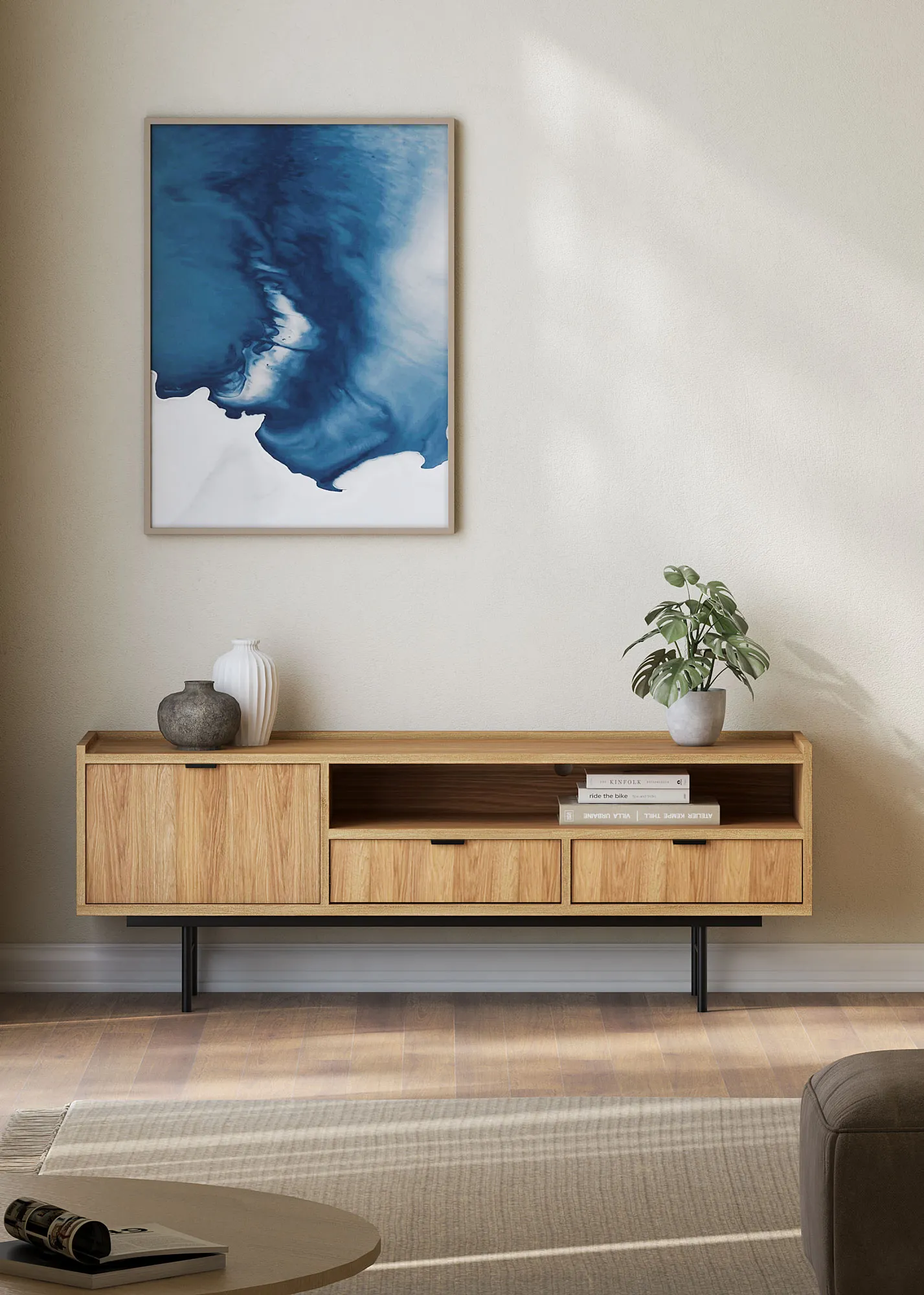 Wnętrze z szafką pod TV na nóżkach Herioz 3X hikora naturalna