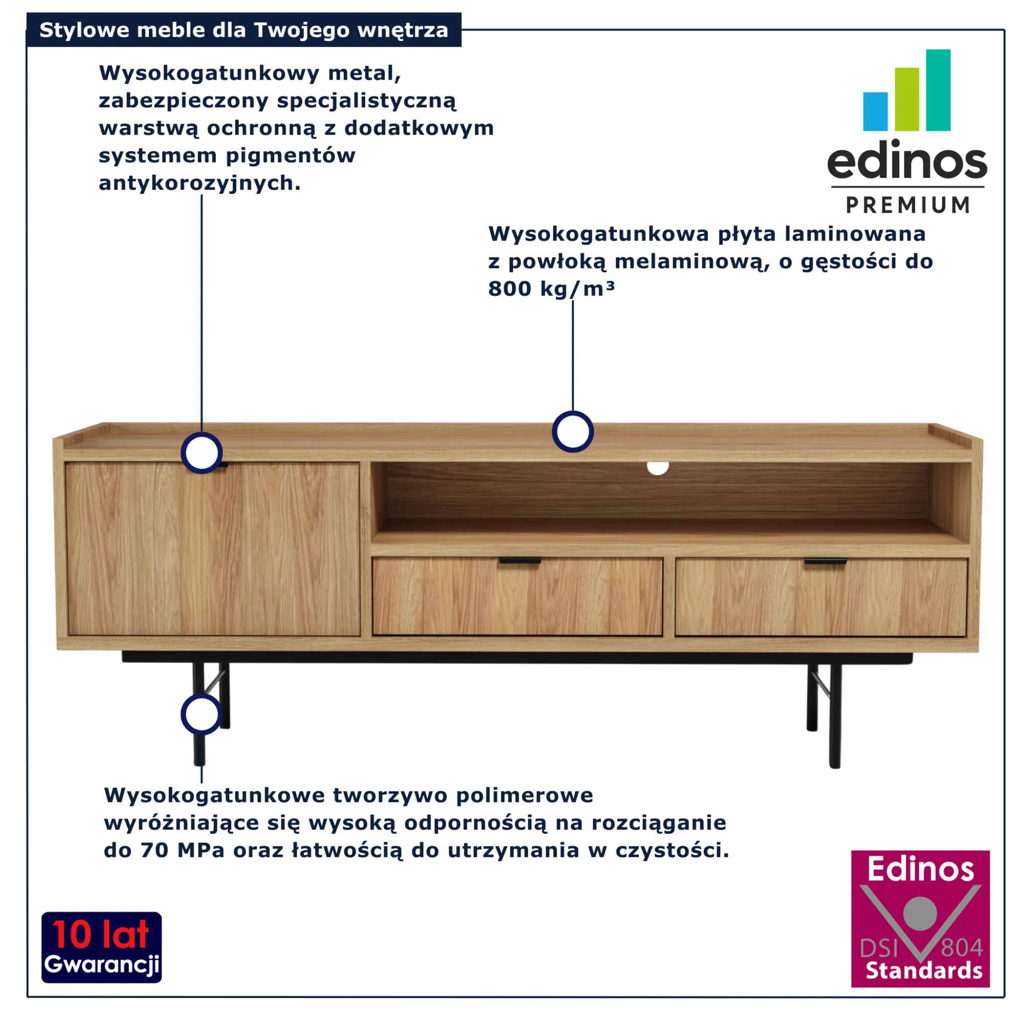 • Produkt posiada certyfikat jakości "Edinos Standards DSI 804", który potwierdza najwyższą jakość wykonania mebla oraz pełny stopień zgodności poszczególnych jednostek wytworzonego wyrobu z przyjętym wzorcem.