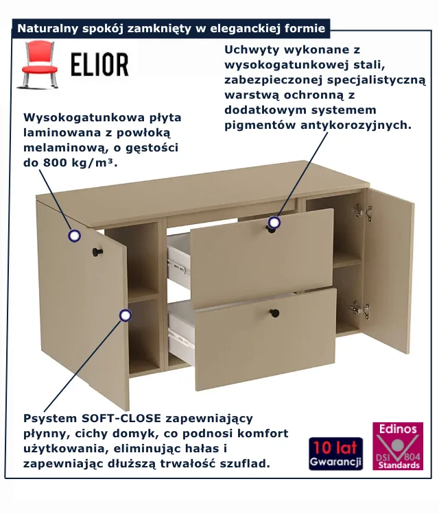 • Produkt posiada certyfikat jakości "Edinos Standards DSI 804", który potwierdza najwyższą jakość wykonania mebla oraz pełny stopień zgodności poszczególnych jednostek wytworzonego wyrobu z przyjętym wzorcem.