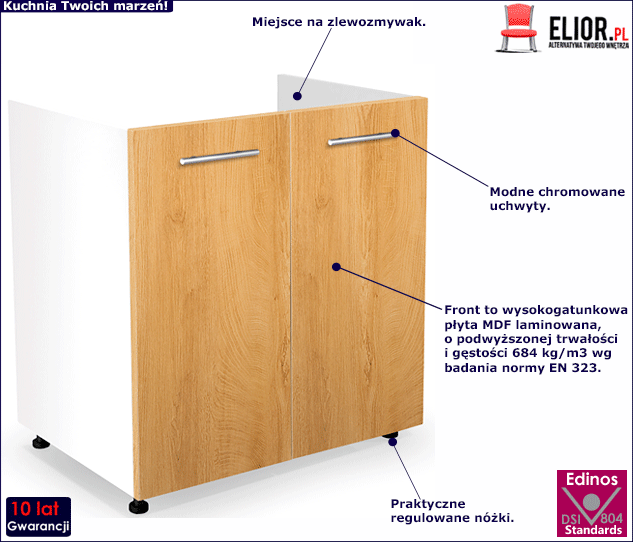 - Kolor: Front w kolorze dębu miodowego, biały korpus. Uchwyty metalowe - chromowane. Kliknij i sprawdź także inne szafki kuchenne w sklepie Edinos.pl. Stwórz swój praktyczny zestaw mebli.
