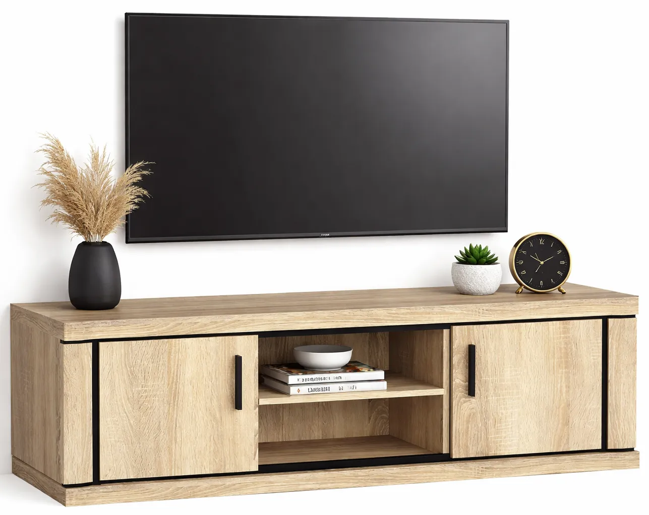 Szafka pod telewizor Rectano 14X to najnowsza propozycja designerów marki Edinos Premium zaprojektowana z myślą o osobach poszukujących praktycznych, trwałych i efektownych mebli. Mebel wyróżnia się prostą, minimalistyczną formą oraz precyzyjnie zaplanowanym wnętrzem do przechowywania. Praktyczna szafka z szerokim blatem na telewizor, 2 otwartymi półkami i 2 zamykanymi szafkami doskonale uzupełni wyposażenie salonu, pokoju dziennego, sypialni, pokoju młodzieżowego, gabinetu lub wnętrz hotelowych. Nowoczesny design pełen szlachetnych detali dekoracyjnych zmiksowany z unikatową kolorystyką w odcieniu dąb sonoma fenomenalnie sprawdzi się w różnorodnych aranżacjach: od stylu industrialnego i minimalistycznego, przez ponadczasową klasykę, aż po klimaty skandynawskie.