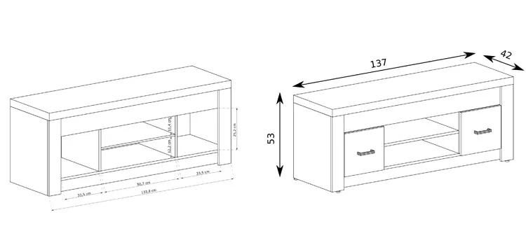- Wymiary całkowite: wysokość: 53 cm, szerokość: 137 cm, głębokość: 42 cm.