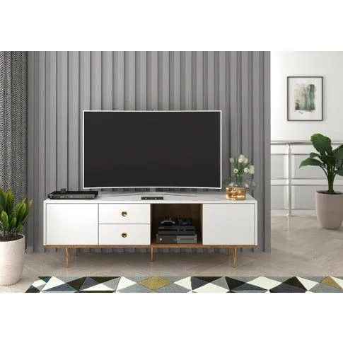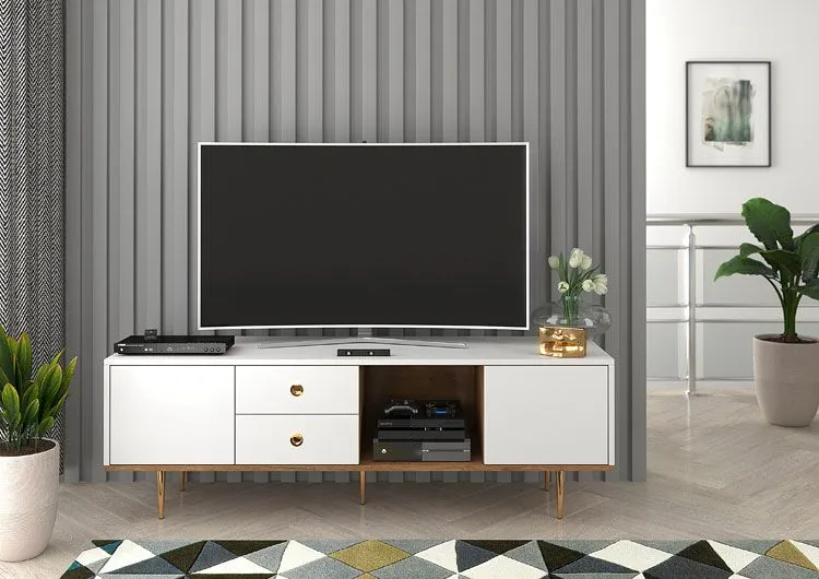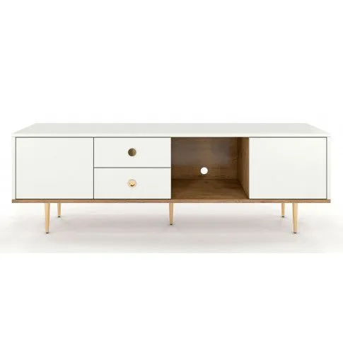 Mebel niezawodny? Szafka RTV! Uniesie telewizor lub inne potrzebne sprzęty, ukryje dokumenty, książki, albumy, płyty, ozdobi wnętrze i wyeksponuje ozdobne bibeloty. Jakoś nie wyobrażamy sobie salonu bez szafki RTV.. Nawet jeśli Twój telewizor wisi na ścianie to pusta ściana pod nim nie wygląda zbyt atrakcyjnie. Szafka RTV zawsze zwraca na siebie uwagę, dlatego watro wybrać taką, która godnie reprezentowała będzie wnętrze. Sobis 3X to designerska szafka w subtelnym odcieniu półmatowej bieli, połączona z dekorem dębu lancelot oraz szykownym złotem. Zarówno po prawej, jak i po lewej stronie szafki znajdują się drzwiczki za którymi ukryta jest półka. Zastosowano w nich nowoczesny system “Push to Open”, dzięki któremu wystarczy lekko nacisnąć na front mebla, a otworzą się automatycznie. W środkowej części mebla znajdują się dwie pojemne szuflady oraz otwarta półka. Szuflady mimo zastosowanych uchwytów również otwierają się za pomocą tego samego systemu, wzbogacono je także w system cichego domyku, dzięki czemu po lekkim pchnięciu zamykają się bezgłośnie - właściwie same. Eleganckie złote nóżki dodają całości lekkiej formy ułatwiając jednocześnie utrzymanie czystości pod meblem. Całość finezyjnie zdobi wnętrze zapewniając dużą ilość miejsca użytkowego na przechowywanie. Sobis 3X to bez wątpienia niezawodny, ponadczasowy i designerski mebel, który zaskoczy swoim wdziękiem zarówno Twoich gości jak i Ciebie samego!
