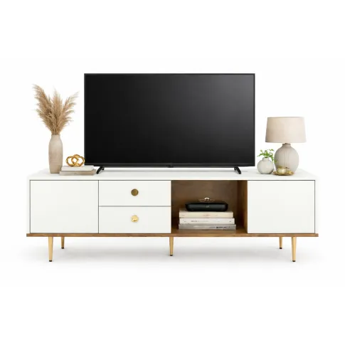 Mebel niezawodny? Szafka RTV! Uniesie telewizor lub inne potrzebne sprzęty, ukryje dokumenty, książki, albumy, płyty, ozdobi wnętrze i wyeksponuje ozdobne bibeloty. Jakoś nie wyobrażamy sobie salonu bez szafki RTV.. Nawet jeśli Twój telewizor wisi na ścianie to pusta ściana pod nim nie wygląda zbyt atrakcyjnie. Szafka RTV zawsze zwraca na siebie uwagę, dlatego watro wybrać taką, która godnie reprezentowała będzie wnętrze. Sobis 3X to designerska szafka w subtelnym odcieniu półmatowej bieli, połączona z dekorem dębu lancelot oraz szykownym złotem. Zarówno po prawej, jak i po lewej stronie szafki znajdują się drzwiczki za którymi ukryta jest półka. Zastosowano w nich nowoczesny system “Push to Open”, dzięki któremu wystarczy lekko nacisnąć na front mebla, a otworzą się automatycznie. W środkowej części mebla znajdują się dwie pojemne szuflady oraz otwarta półka. Szuflady mimo zastosowanych uchwytów również otwierają się za pomocą tego samego systemu, wzbogacono je także w system cichego domyku, dzięki czemu po lekkim pchnięciu zamykają się bezgłośnie - właściwie same. Eleganckie złote nóżki dodają całości lekkiej formy ułatwiając jednocześnie utrzymanie czystości pod meblem. Całość finezyjnie zdobi wnętrze zapewniając dużą ilość miejsca użytkowego na przechowywanie. Sobis 3X to bez wątpienia niezawodny, ponadczasowy i designerski mebel, który zaskoczy swoim wdziękiem zarówno Twoich gości jak i Ciebie samego!