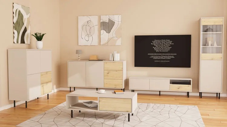 • Nowoczesny wygląd w kolorze kaszmir + dąb artisan pasuje do różnych aranżacji salonu