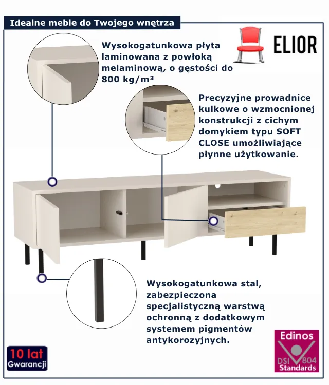 • Produkt posiada certyfikat jakości "Edinos Standards DSI 804", który potwierdza najwyższą jakość wykonania mebla oraz pełny stopień zgodności poszczególnych jednostek wytworzonego wyrobu z przyjętym wzorcem.