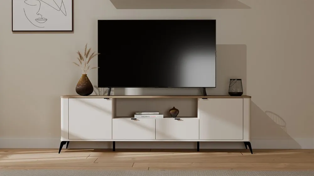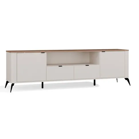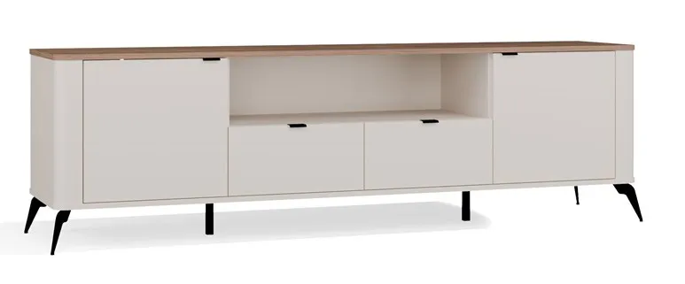 Szafka RTV z kolekcji Sodo 5X to idealne połączenie elegancji i funkcjonalności. Wyposażona w dwie szuflady, dwie szafki oraz otwartą półkę na sprzęt multimedialny, pozwala utrzymać w salonie wizualny porządek i estetykę. Zaokrąglone boki, nowoczesne uchwyty oraz wysokie metalowe nogi nadają jej lekkości i ponadczasowego charakteru. To mebel stworzony z myślą o tych, którzy cenią zarówno design, jak i wygodę użytkowania.