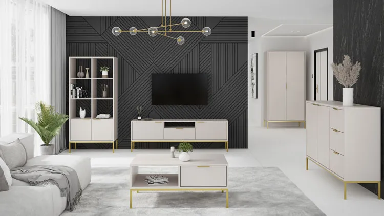 Jestem naprawdę zadowolony z zakupu. Szafka wygląda elegancko i nowocześnie, a połączenie koloru kaszmir ze złotymi elementami robi świetne wrażenie. Ma sporo miejsca do przechowywania, więc łatwo utrzymać porządek przy sprzęcie RTV. Dodatkowo jest stabilna i dobrze wykonana, dzięki czemu całość sprawia solidne wrażenie i dobrze komponuje się z wystrojem mojego salonu.