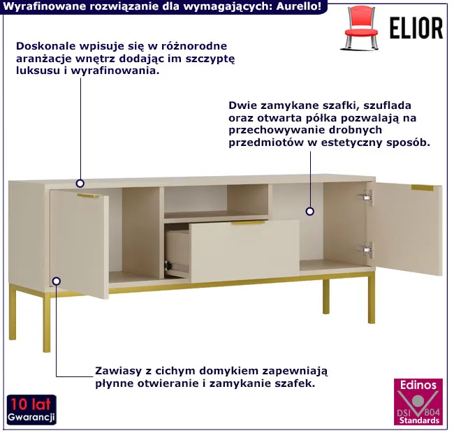 Kolekcja Aurello marki Edinos Premium to wizytówka nowoczesnego stylu glamour, która nada Twojemu wnętrzu wyjątkowego blasku. Każdy element zestawu został zaprojektowany z myślą o maksymalnym komforcie użytkowania i niespotykanej elegancji. Z Aurello wprowadzisz do swojego domu odrobinę luksusu, który natychmiast przyciągnie wzrok. Wyrafinowane detale, takie jak złote stelaże i subtelne uchwyty, czynią te meble prawdziwymi dziełami sztuki. Niezależnie od tego, czy wyposażysz nimi salon, czy sypialnię, zyskasz przestrzeń o niepowtarzalnym charakterze. Pozwól, by kolekcja Aurello od Edinos Premium stała się sercem Twojego domu, łącząc w sobie elegancję i funkcjonalność.