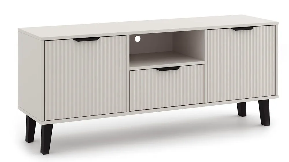 Strefa multimedialna w salonie zasługuje na wyjątkową oprawę – nie tylko ze względu na estetykę, ale też komfort codziennego użytkowania. Szafka RTV Henex  7X marki Edinos Premium to idealne połączenie funkcjonalności i nowoczesnego designu, które wprowadzi do Twojego wnętrza porządek i harmonię. Jej smukła bryła, ryflowane fronty oraz wysokie, czarne nóżki dodają lekkości i subtelnej elegancji. Dostępna w dwóch modnych wykończeniach – kaszmir oraz dąb artisan – świetnie komponuje się zarówno z jasnymi, jak i ciemniejszymi aranżacjami. Praktyczne wnętrze z przemyślanym układem szafek, szuflady i wnęki pozwala wygodnie przechowywać cały domowy sprzęt multimedialny, a otwór na przewody ułatwia ich dyskretne uporządkowanie.